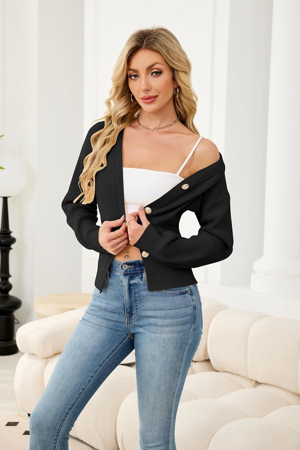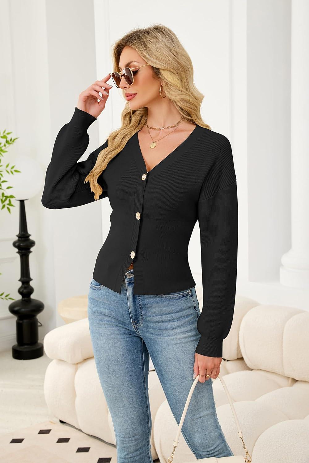 ECOWISH Cardigan Sweaters for Women 2025 Fall Long Sleeve V Neck Button Down Cropped Sweater Winter Ribbed Knit Outwear(475 Black)