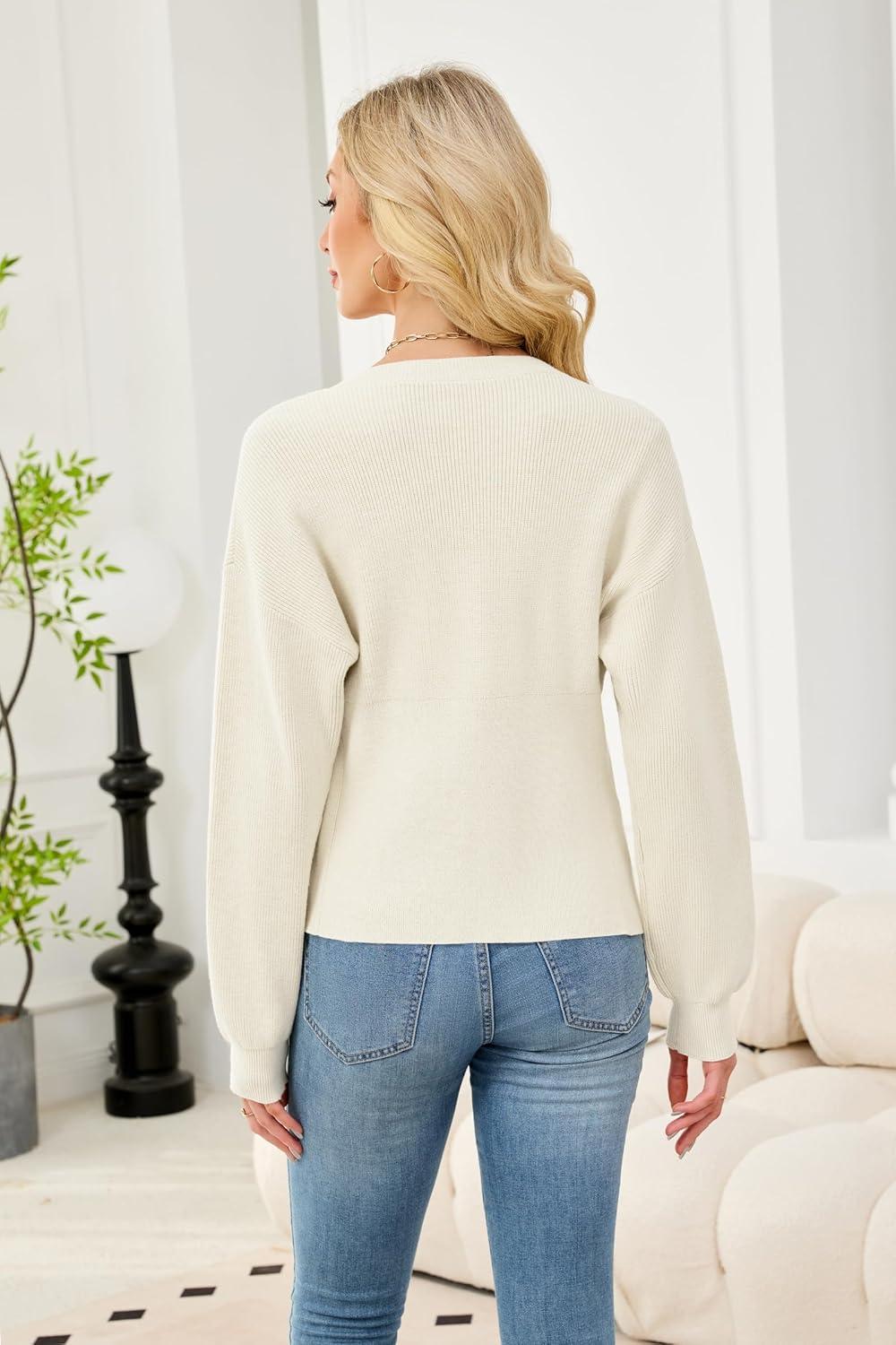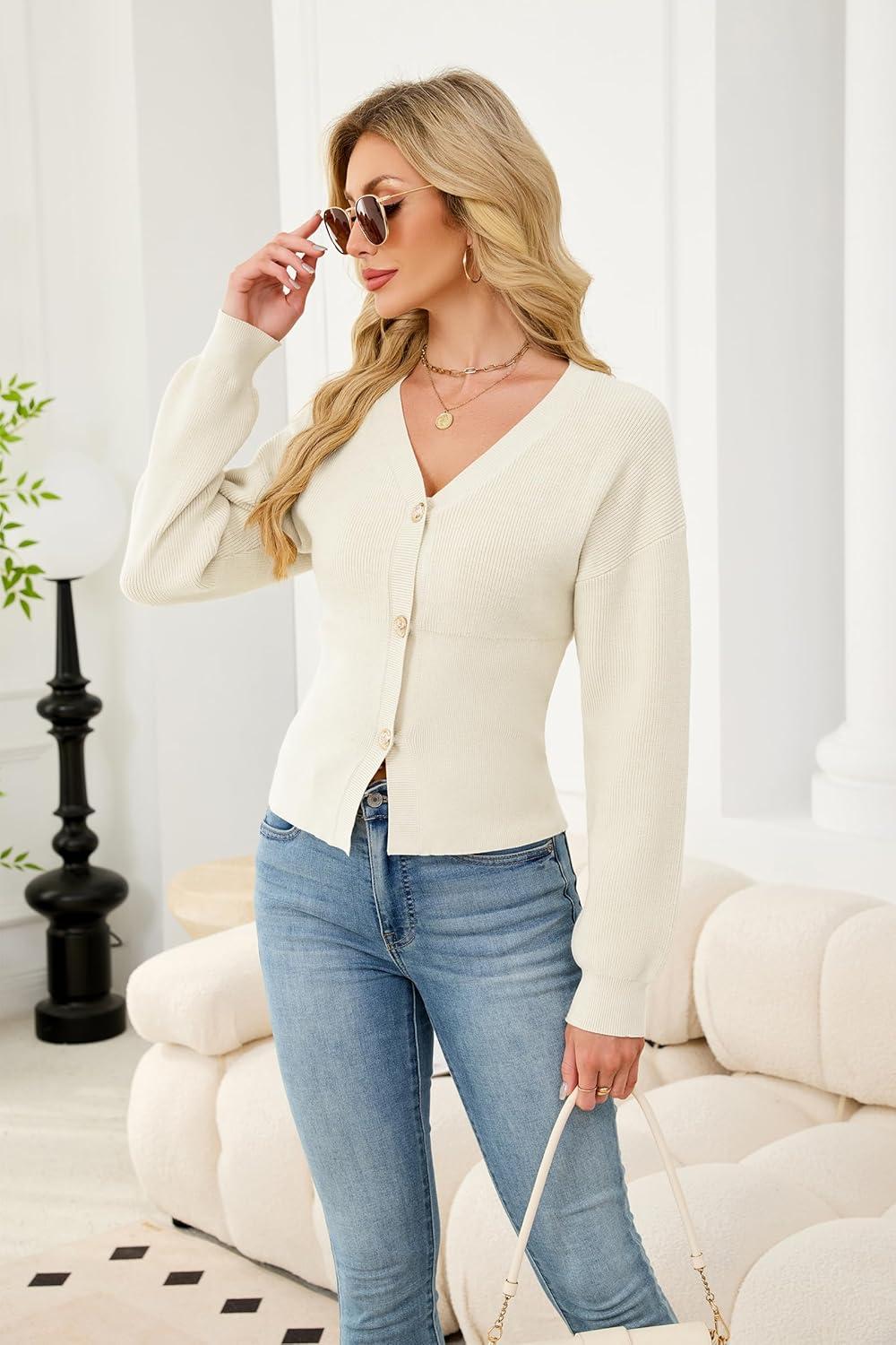ECOWISH Cardigan Sweaters for Women 2025 Fall Long Sleeve V Neck Button Down Cropped Sweater Winter Ribbed Knit Outwear(475 White)