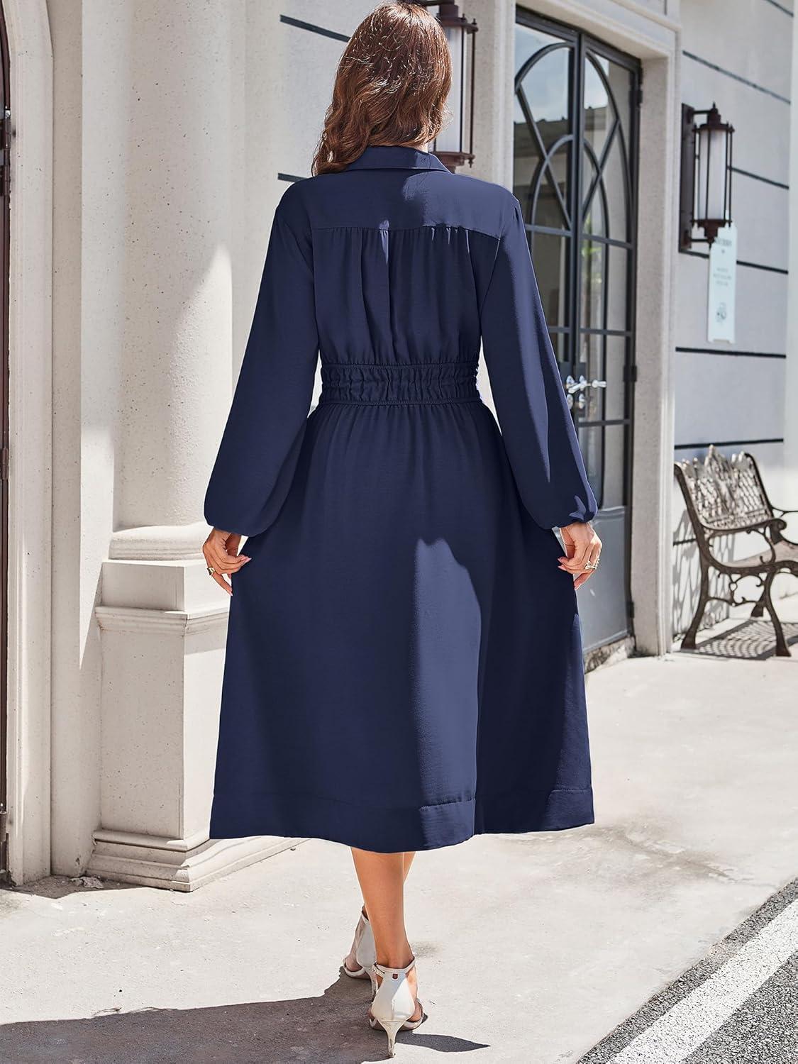 ECOWISH Short Sleeve Womens Dress Summer Lapel Collar Button Front Casual A-Line Maxi Midi Shirt Dresses with Pockets(63navy Blue)