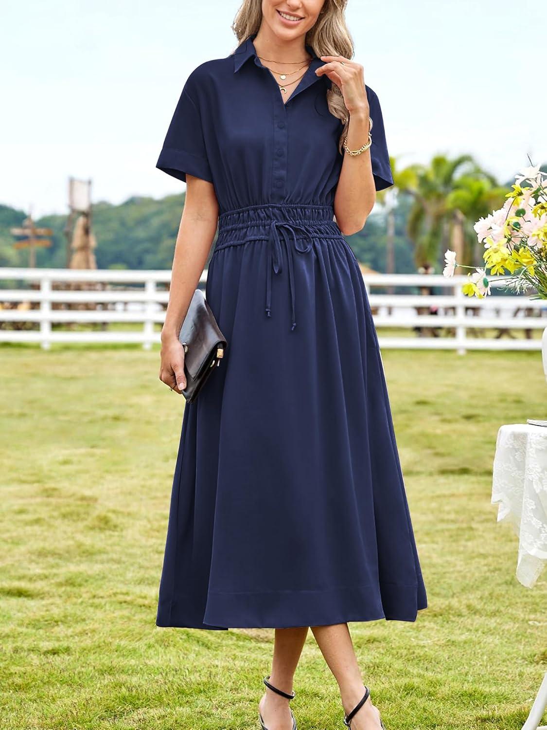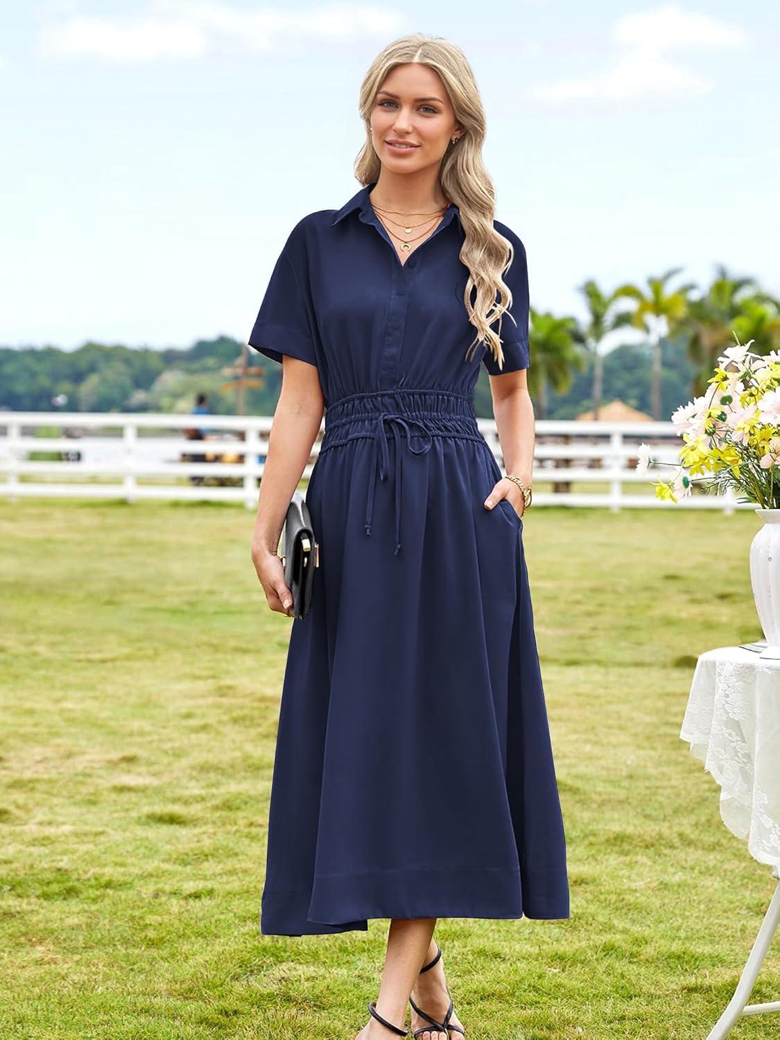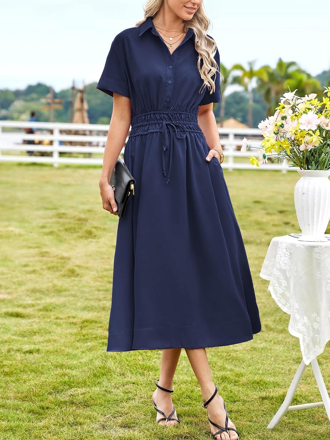 ECOWISH Short Sleeve Womens Dress Summer Lapel Collar Button Front Casual A-Line Maxi Midi Shirt Dresses with Pockets(Navy Blue)