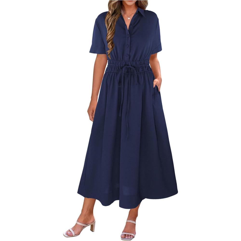 Be the first to review “ECOWISH Short Sleeve Womens Dress Summer Lapel Collar Button Front Casual A-Line Maxi Midi Shirt Dresses with Pockets(Navy Blue)”