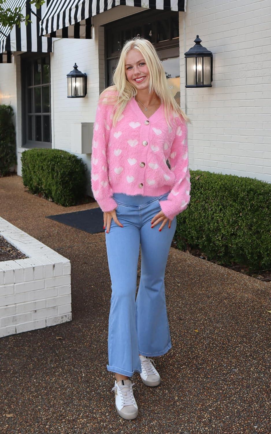ECOWISH Women Floral Cropped Cardigan: Fall Long Sleeve Button Down Fuzzy Heart Print Knit Sweaters Casual Y2k Outerwear(407 Pink)