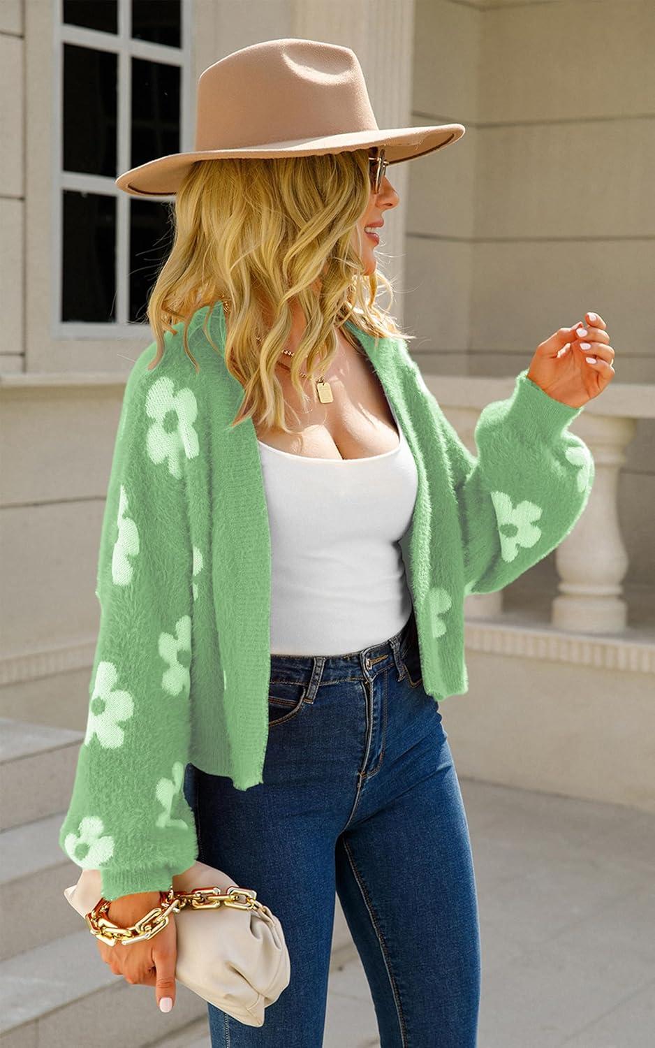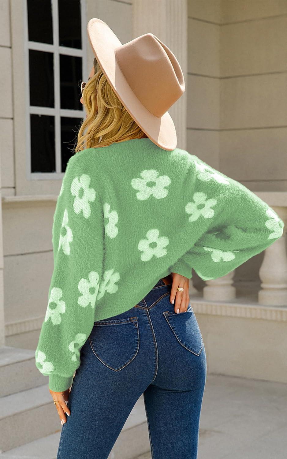 Get your hands on our exclusive ECOWISH Women Floral Cropped Cardigan: Fall Long Sleeve Button Down Fuzzy Heart Print Knit Sweaters Casual Y2k Outerwear(Green) collection, now at a discounted price.