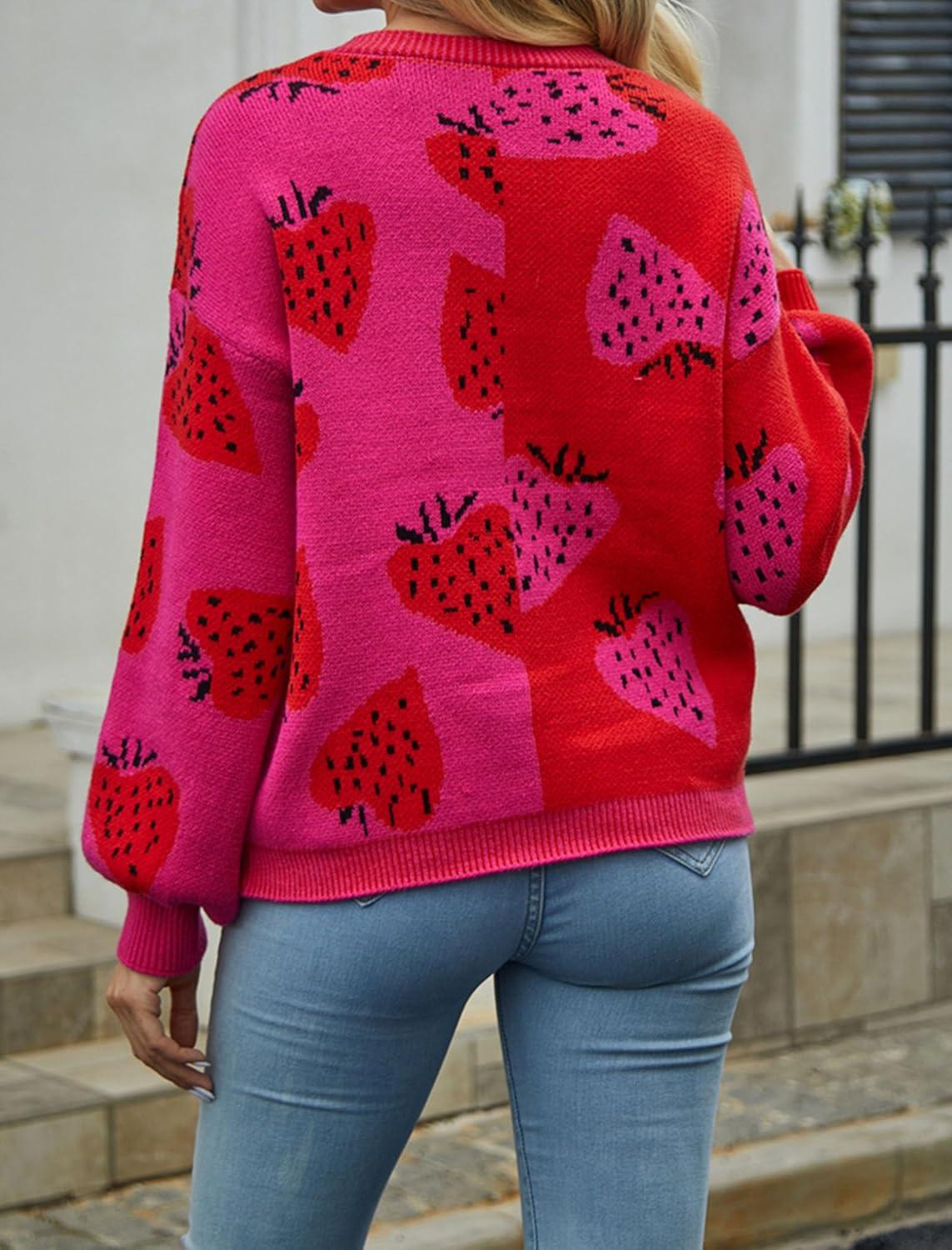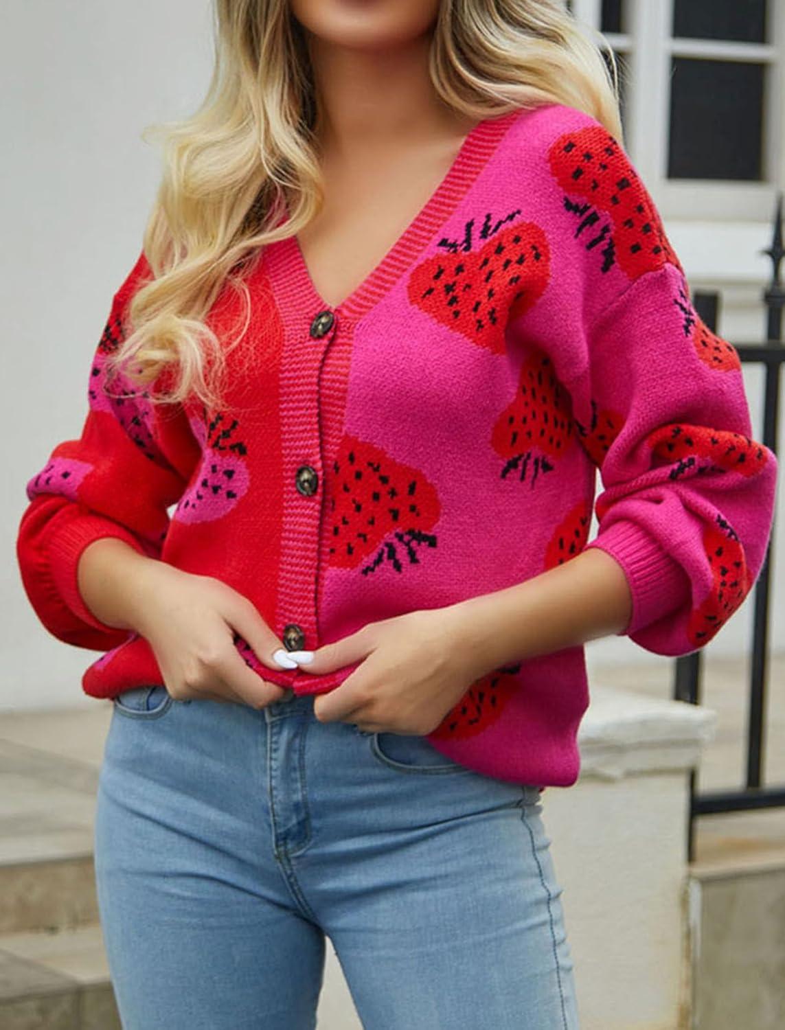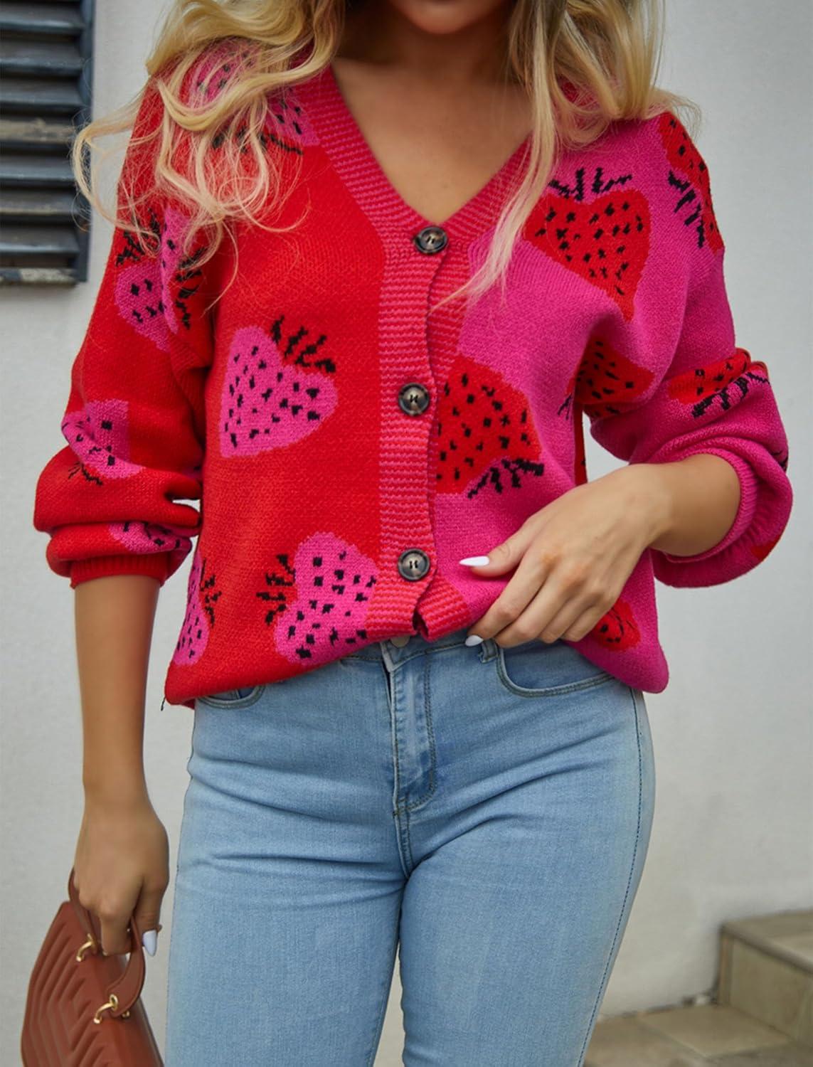 ECOWISH Women Floral Cropped Cardigan: Fall Long Sleeve Button Down Fuzzy Heart Print Knit Sweaters Casual Y2k Outerwear(Strawberry(red))