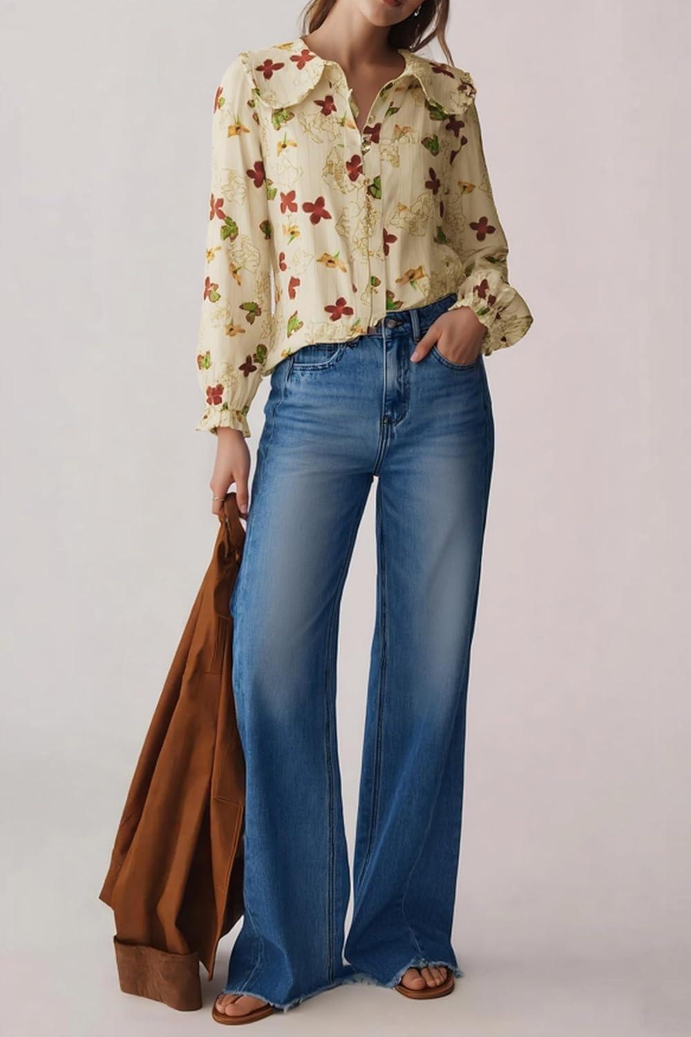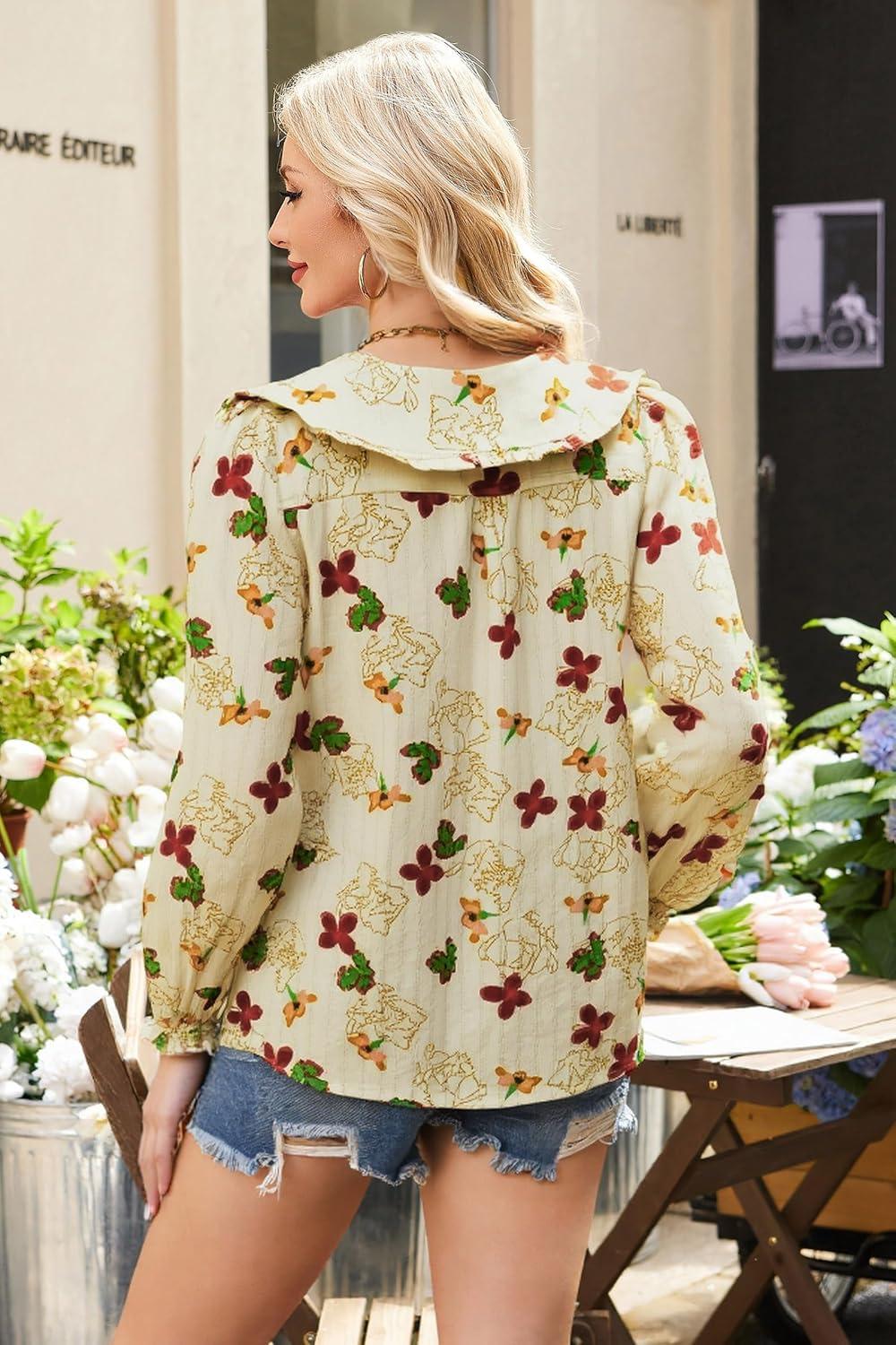 ECOWISH Women’s Long Sleeve Shirts – Peter Pan Collar Button Down Blouse Dressy Casual Puff Cotton Elegant Fall Tops(3461 Beige)
