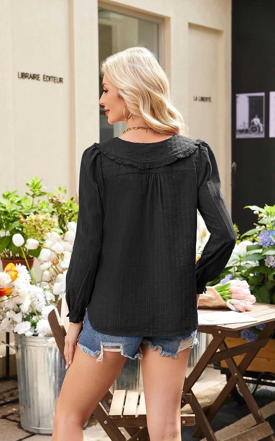 ECOWISH Women’s Long Sleeve Shirts – Peter Pan Collar Button Down Blouse Dressy Casual Puff Cotton Elegant Fall Tops(3461 Black)