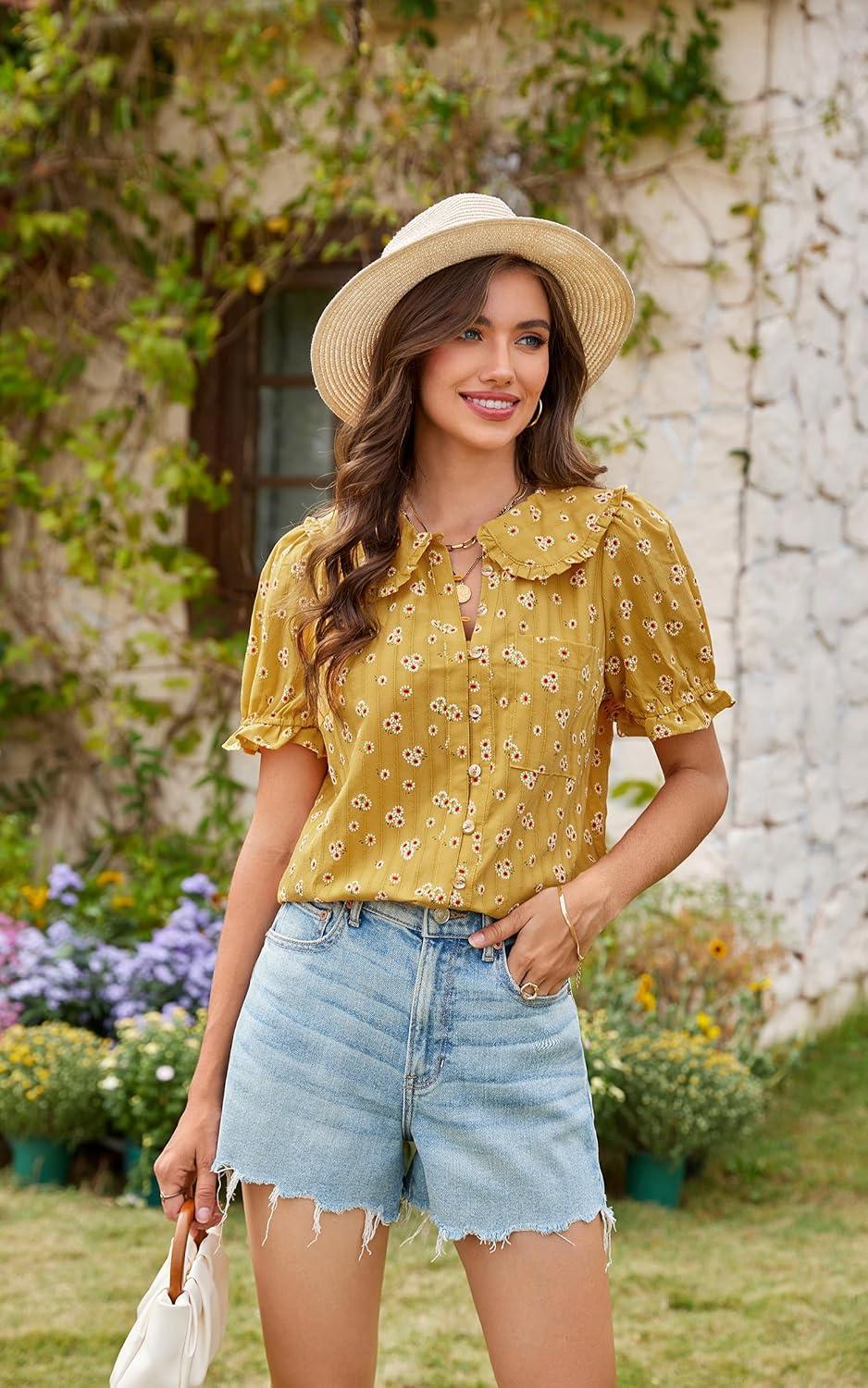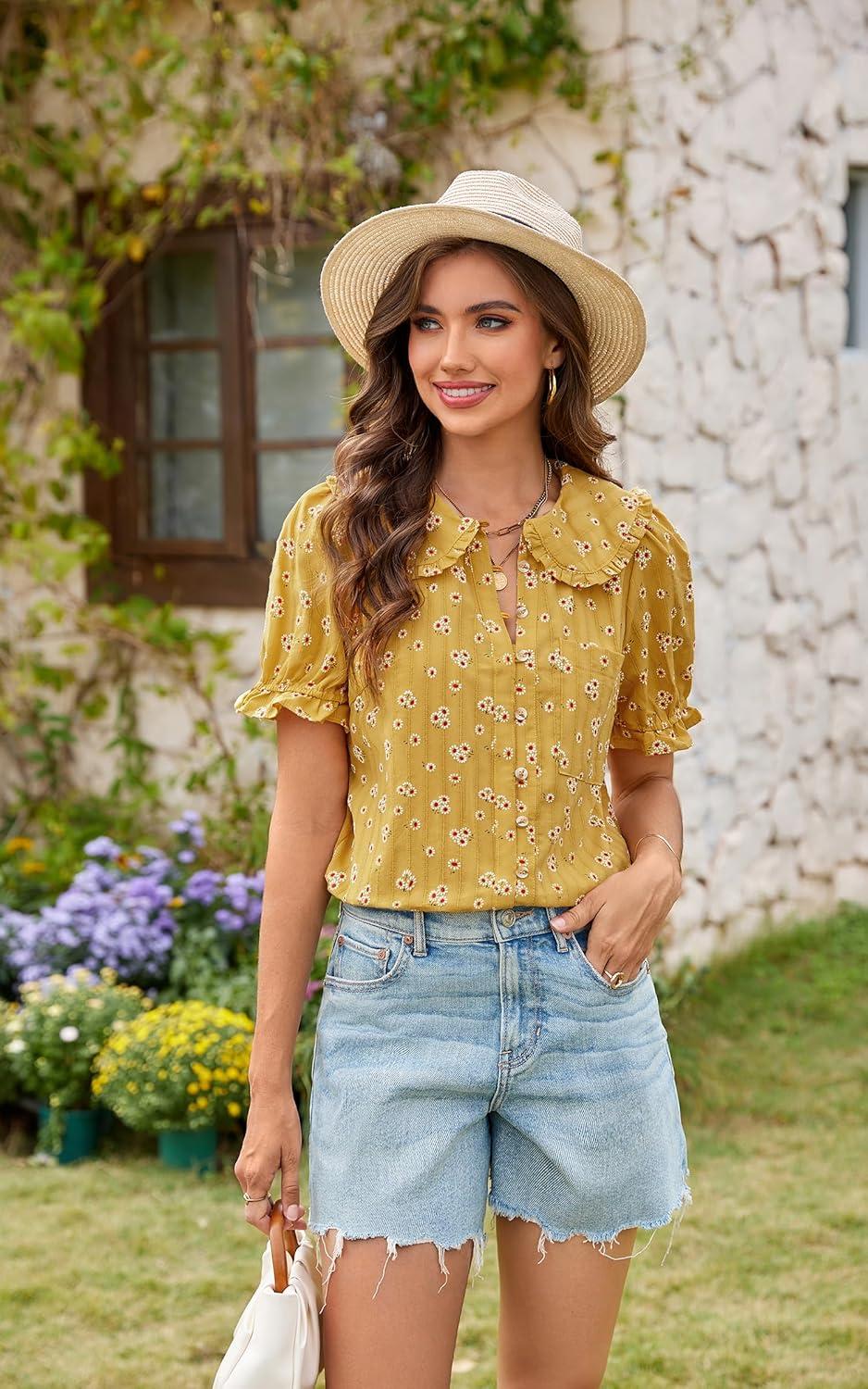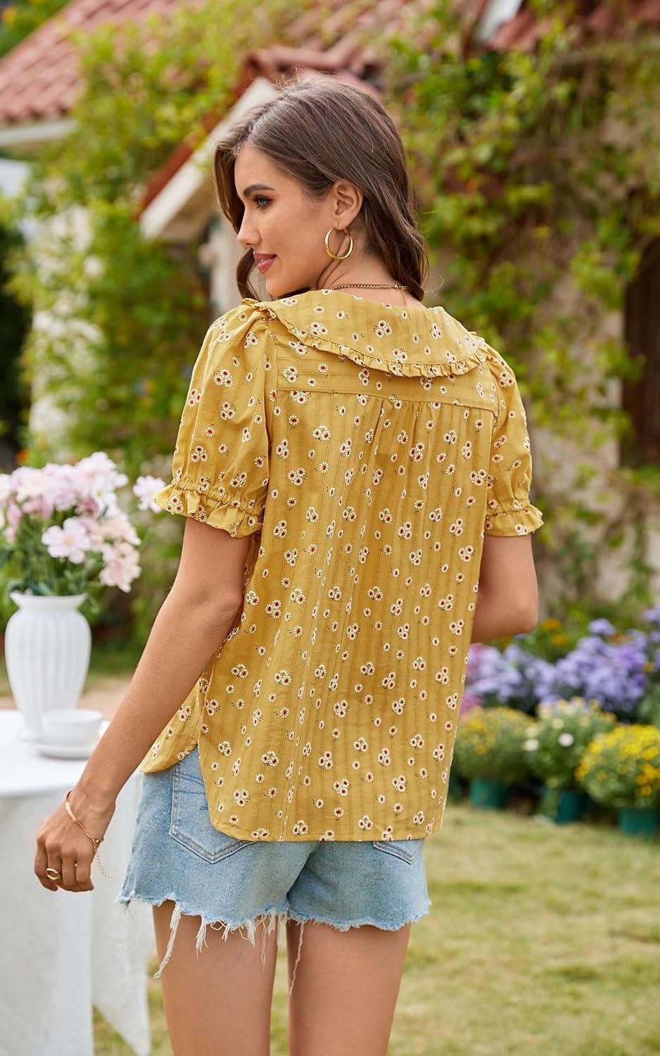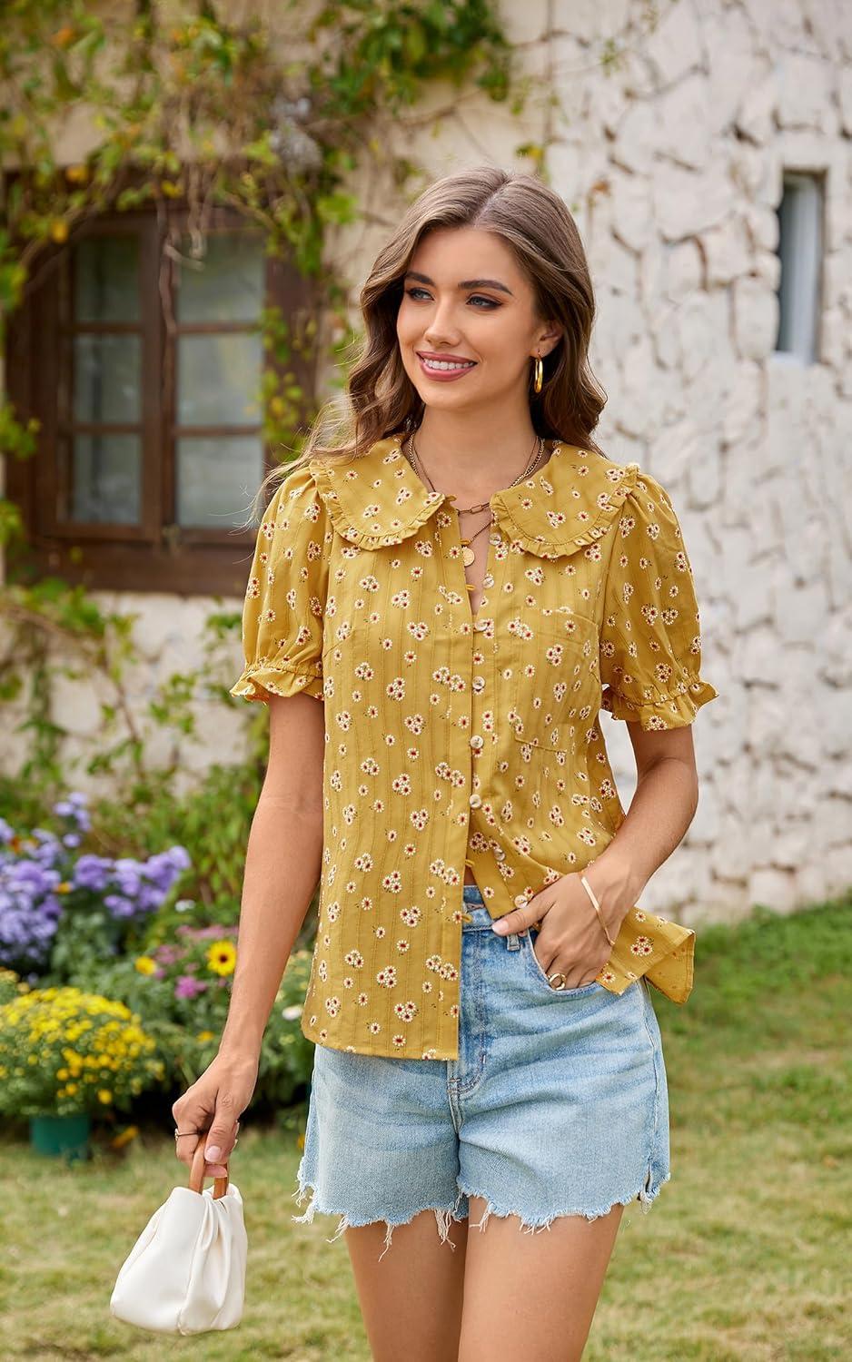 ECOWISH Women’s Long Sleeve Shirts – Peter Pan Collar Button Down Blouse Dressy Casual Puff Cotton Elegant Fall Tops(Yellow Flower)
