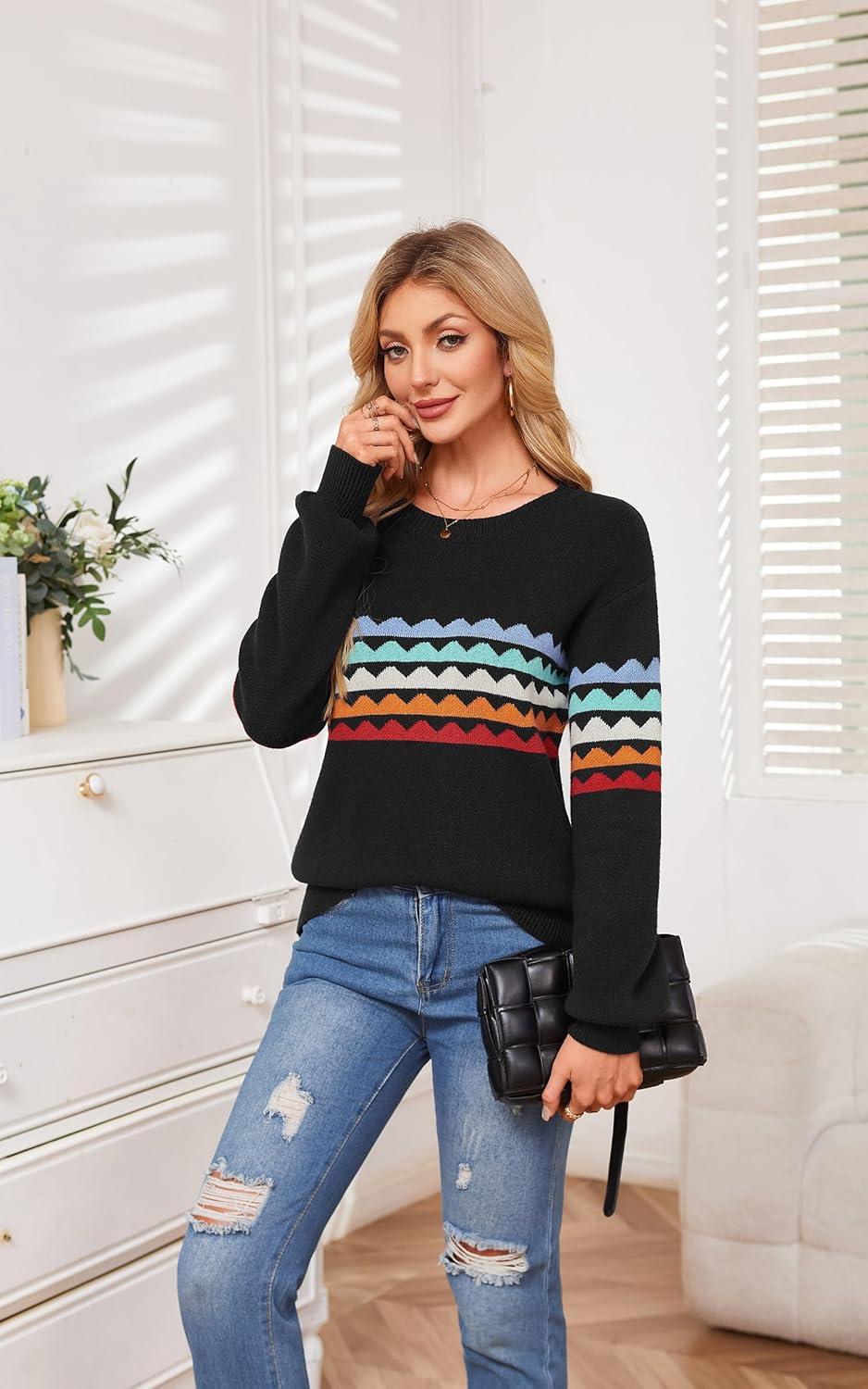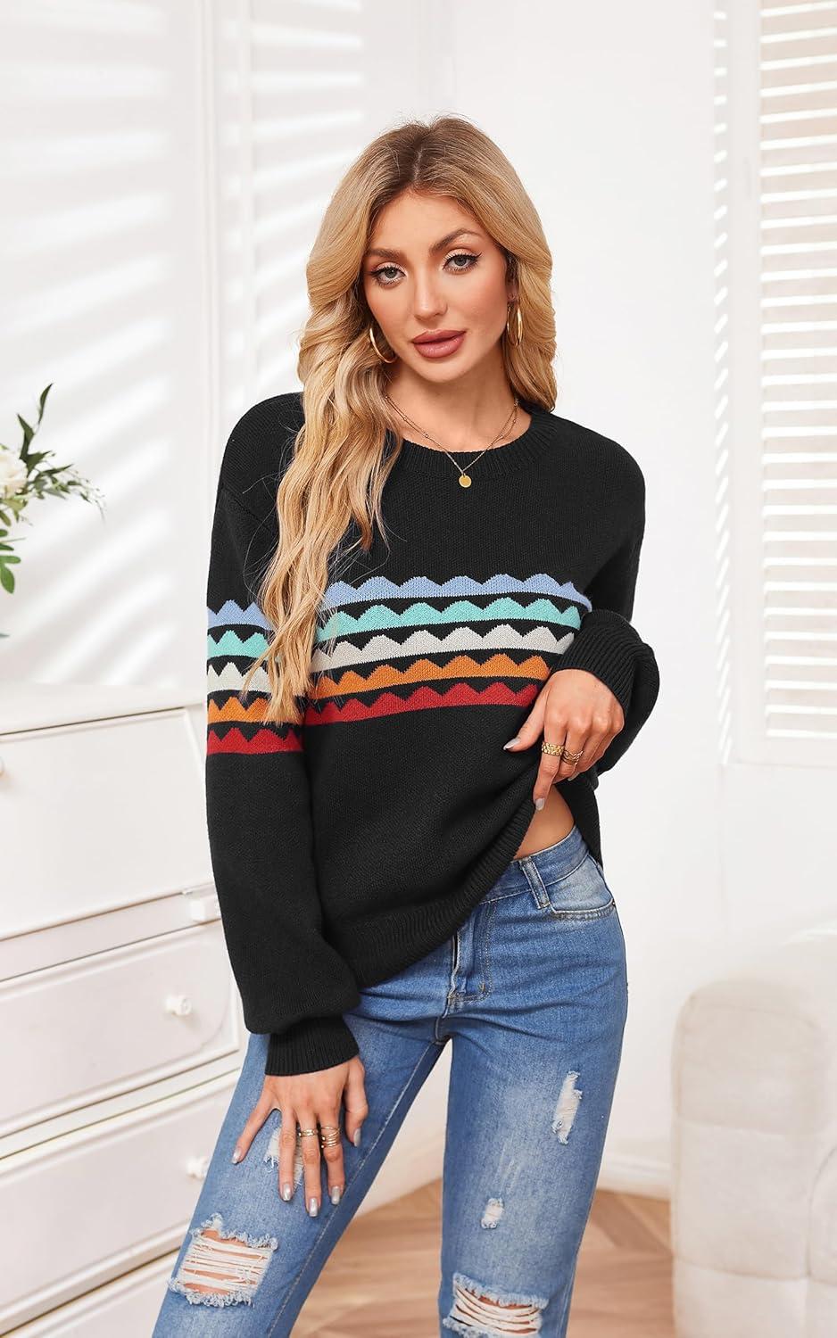 ECOWISH Women's Sweater Rainbow Colorful Striped Sweaters Long Sleeve Crew Neck Color Block Casual Pullover Blouse Tops(3474 Black)